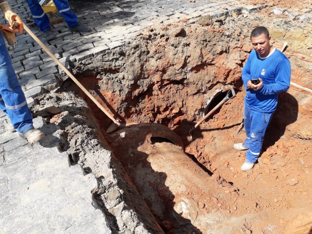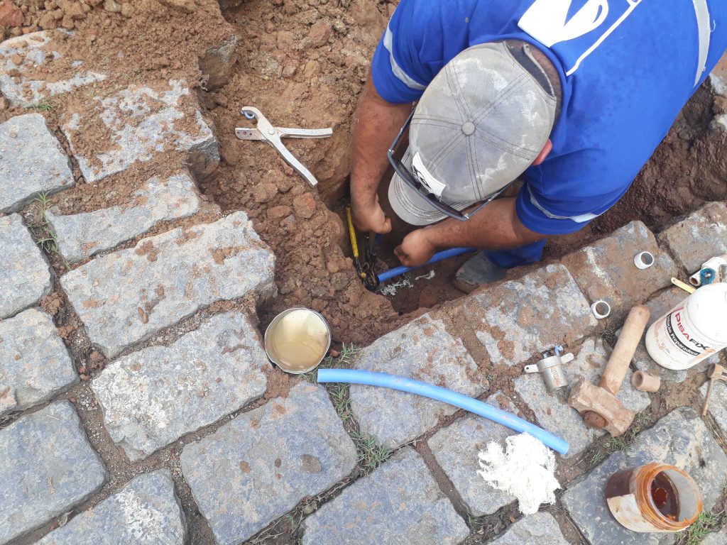 Grandes ações estão aparecendo devido a problemas com o encanamento antigo existente na cidade. Durante o final de semana, realizamos um reparo na rede pluvial que afetou o abastecimento dos bairros Lagoa Seca, Santa Mônica e arredores.  Um trabalho que exigiu muita habilidade e conhecimento técnico pois a rede exigiu emendas na parte antiga de cimento amianto a um novo trecho de ferro. Mais uma vez os encanamentos antigos tendo de ser reparados.