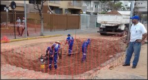 Era impossível não ficar impressionado com o trabalho dos funcionários. Em um buraco de quatro metros e com a mobilidade reduzida por causa do escoramento que era necessário no local, equipes de água e esgoto se revezavam para olhar, analisar, fazer prospecção de terreno e ver possíveis furos ou rachaduras no interceptor utilizando tinta biodegradável de todas as cores procurando incessantemente por onde saía o esgoto no ribeirão São Lourenço.